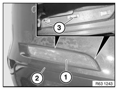 Pull reflector (1) out of guide and detach towards rear from bumper trim (2).