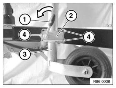 Turn clamping lever (1) in direction of arrow and release clamping connection. Open clamping bracket (2) and remove jockey wheel (3). Release screws on mount (4) and remove screws.
