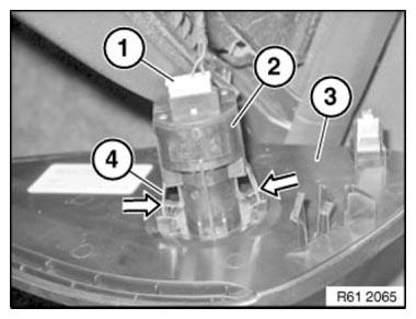 Unlock switch for glove box light (1) on both sides and press in direction of arrow out of glove box (2).