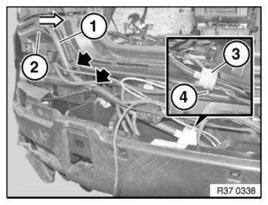 Pull ventilation line (1) in direction of arrow out of bumper trim (2).